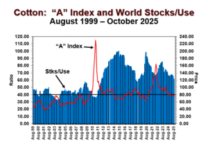 This graph shows monthly world stocks-to-use estimates (in percent) matched against the A-index of world cotton prices (in cents per lb). As usual, stocks-to-use moves in the opposite direction from world prices. An apparent key threshold is 40% world stocks-to-use (dark horizontal line) which is the point where major trends in world prices (either up or down trends) tend to change direction.