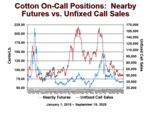 The federal Commodity Futures Trading Commission (CFTC) publishes a report showing the quantity of cotton that has been bought or sold where the sales price has not yet been fixed. This type of contracting is normally for basis contracts, which are also referred to as “on call” contracts. Textile mills routinely buy cotton from merchants using “on call” contracts. When these parties enter in to the “on call” contract, a futures contract would normally be sold to hedge the transaction. Later, when the mill actually fixes the price, that short futures position would be bought back. This could be done with options or futures. To the extent that mills don’t independently cover their options positions, their un-priced “on call” contracts are reflected in the current “on call” sales report, under “Unfixed Call Sales”, which is reported by individual futures contract.