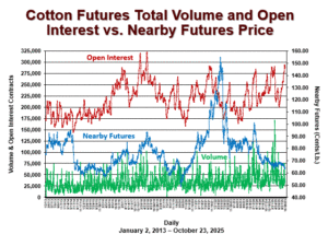The current allocation of volume, open interest, and a lot more cotton futures information, can be found on the ICE futures website under “Featured Reports”. Volume (viewed above as the green line) is defined as the total daily number of contracts traded in a daily session. The level of volume is often used to gauge the strength of continuing or changing trends. Typical cotton daily volume bounces around between 10,000 and 25,000 contracts. Through Thursday, October 23, ICE cotton futures showed mostly average volumes between 28,169 contracts (on October 23) and 39,345 contracts (on October 21). The Dec’25 and Mar’26 contracts had 58% and 25% of the volume, respectively, as of October 23.
