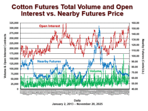 The current allocation of volume, open interest, and a lot more cotton futures information, can be found on the ICE futures website under “Featured Reports”. Volume (viewed above as the green line) is defined as the total daily number of contracts traded in a daily session. The level of volume is often used to gauge the strength of continuing or changing trends. Typical cotton daily volume bounces around between 10,000 and 25,000 contracts. Through Thursday, November 20, ICE cotton futures showed above average volumes between 35,679 contracts (on November 20) and 97,819 contracts (on November 14. The Mar’26 and May’26 contracts had 60% and 16% of the volume, respectively, as of November 20.